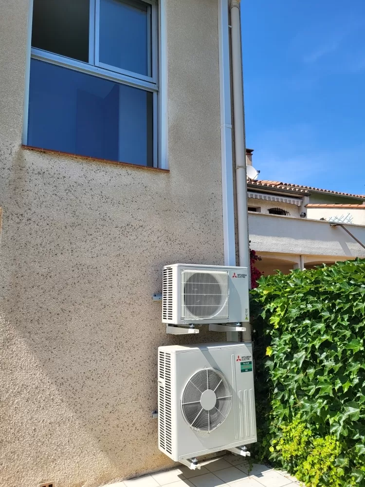 Installation en rénovation d'une pompe à chaleur air/air Mitsubishi de type console 7KW pour le séjour avec bi-split pour les chambres sur la commune de Perpignan